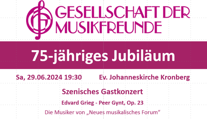 Die Gesellschaft der Musikfreunde Bad Soden a.Ts. e.V. begeht in diesem Jahr das 75-jährige Jubiläum ihres Bestehens. Aus diesem Anlass findet im Rahmen eines Kooperationsprojekts in der Johanneskirche Kronberg im Taunus am Samstag, dem 29.6.2024 ein szenisches Gastkonzert statt, ausgerichtet von den Musikern von Chor und Orchester der Vereinigung „Neues musikalisches Forum“ unter Leitung des Dirigenten Alexander Ebert. Der Beginn ist 19:30 Uhr. Der Eintritt ist frei, Spenden werden erbeten.